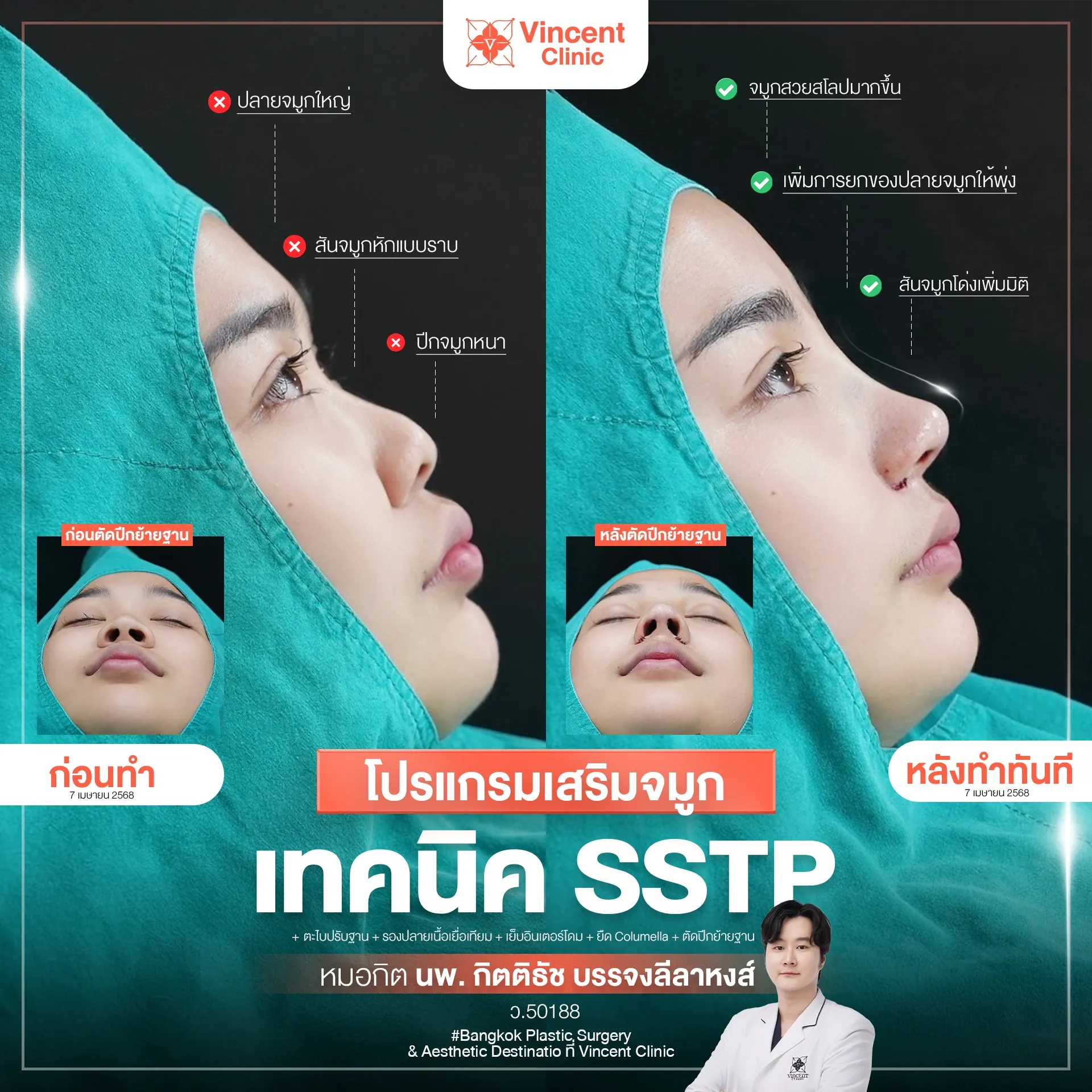 - ทรงจมูกสวยพุ่งละมุน เทคนิค SSTP ช่วยออกแบบทรงจมูกแบบ Semi-Custom ให้โด่งพุ่งละมุนรับกับใบหน้าคนไทย เมื่อทำร่วมกับการตัดปีกจมูกจะช่วยให้ฐานจมูกดูเรียวเล็กและสมดุลกับปลายจมูกที่พุ่งขึ้นอย่างชัดเจน