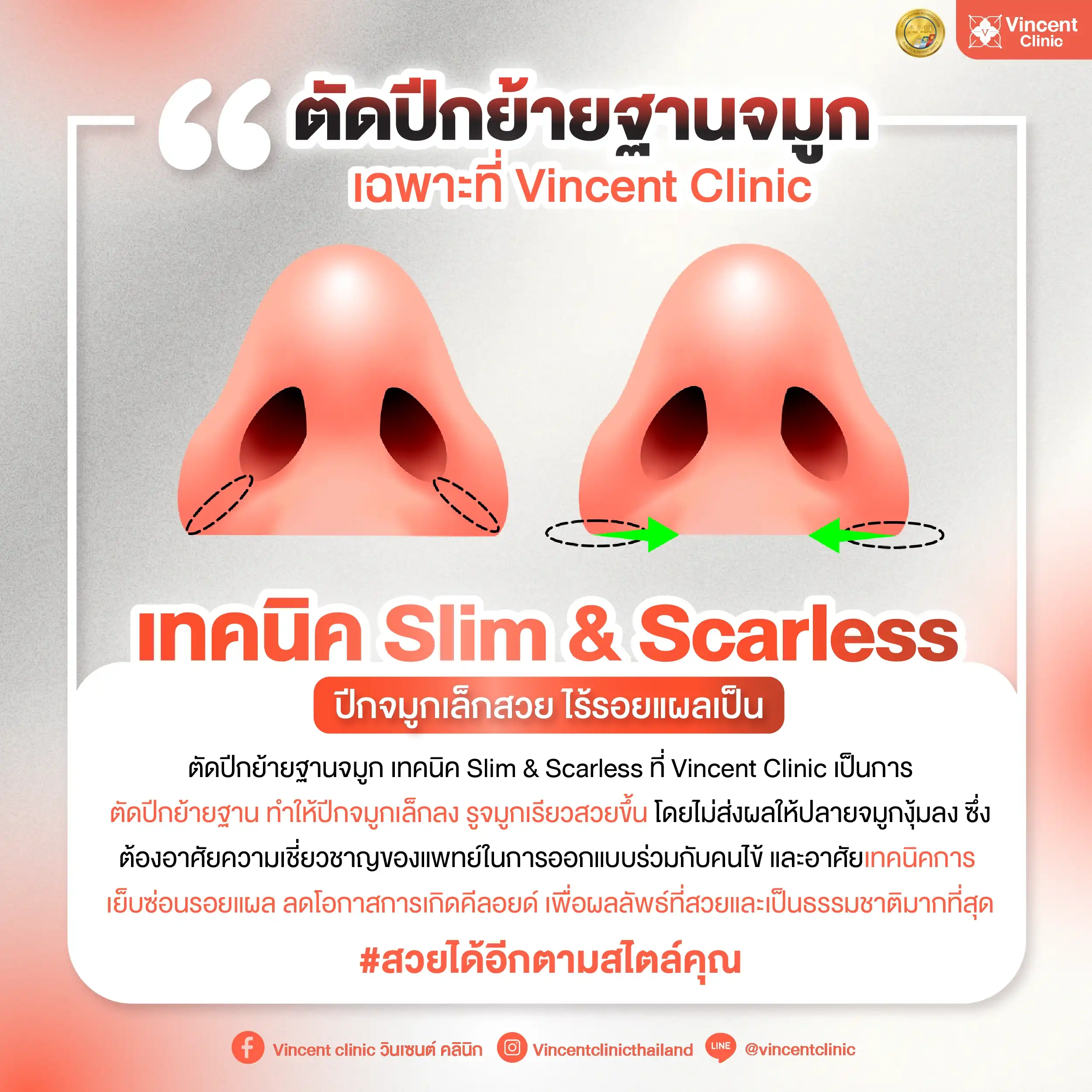 ตัดปีกจมูก เทคนิค Slim & Scarless ที่วินเซนต์คลินิก เป็นนวัตกรรมเฉพาะสำหรับการตัดปีกย้ายฐานจมูกที่มุ่งเน้นผลลัพธ์ความเป็นธรรมชาติและไร้กังวลเรื่องรอยแผล โดยหัวใจสำคัญของเทคนิคนี้คือการปรับรูปทรงปีกจมูกให้เล็กลงและทำให้รูจมูกดูเรียวสวยขึ้น