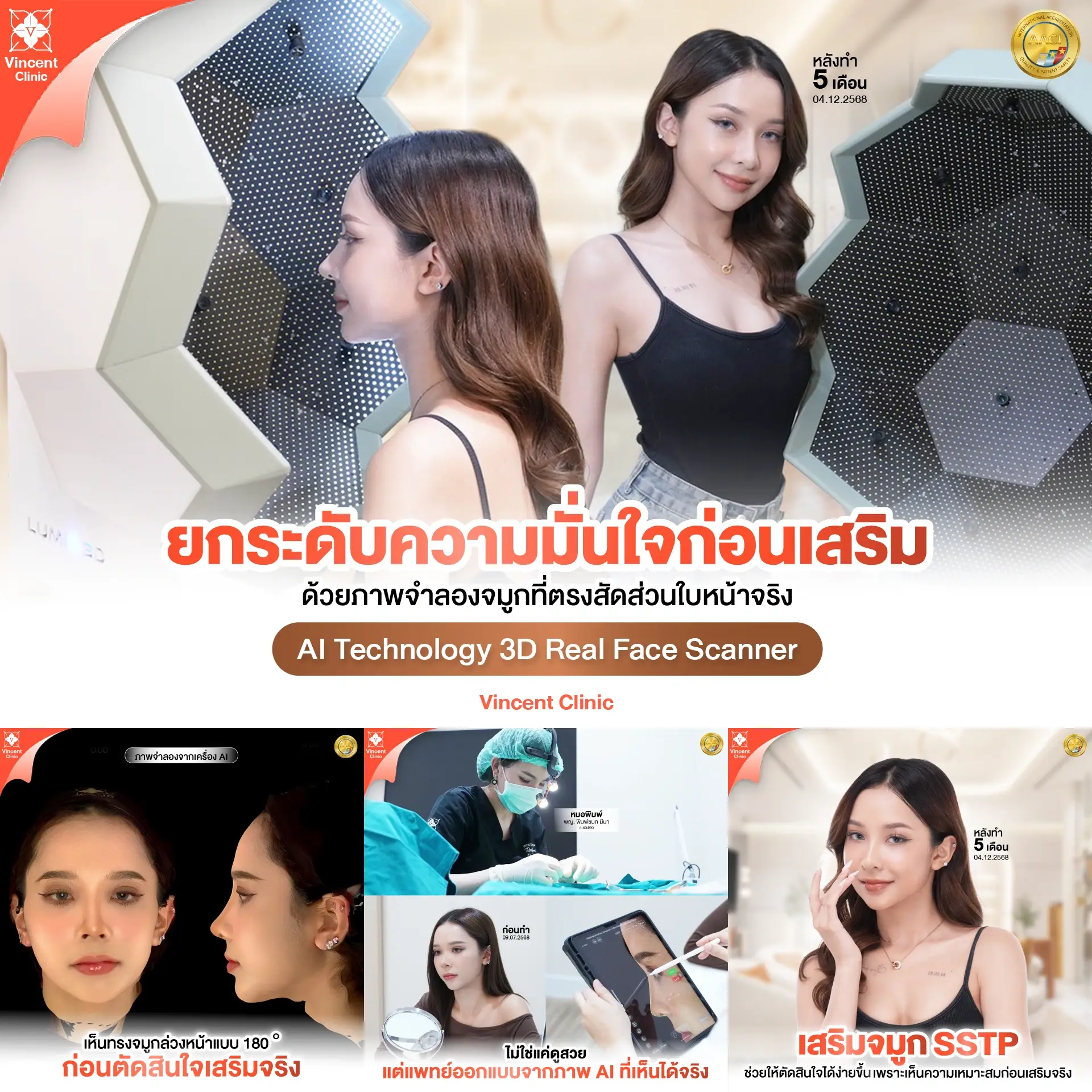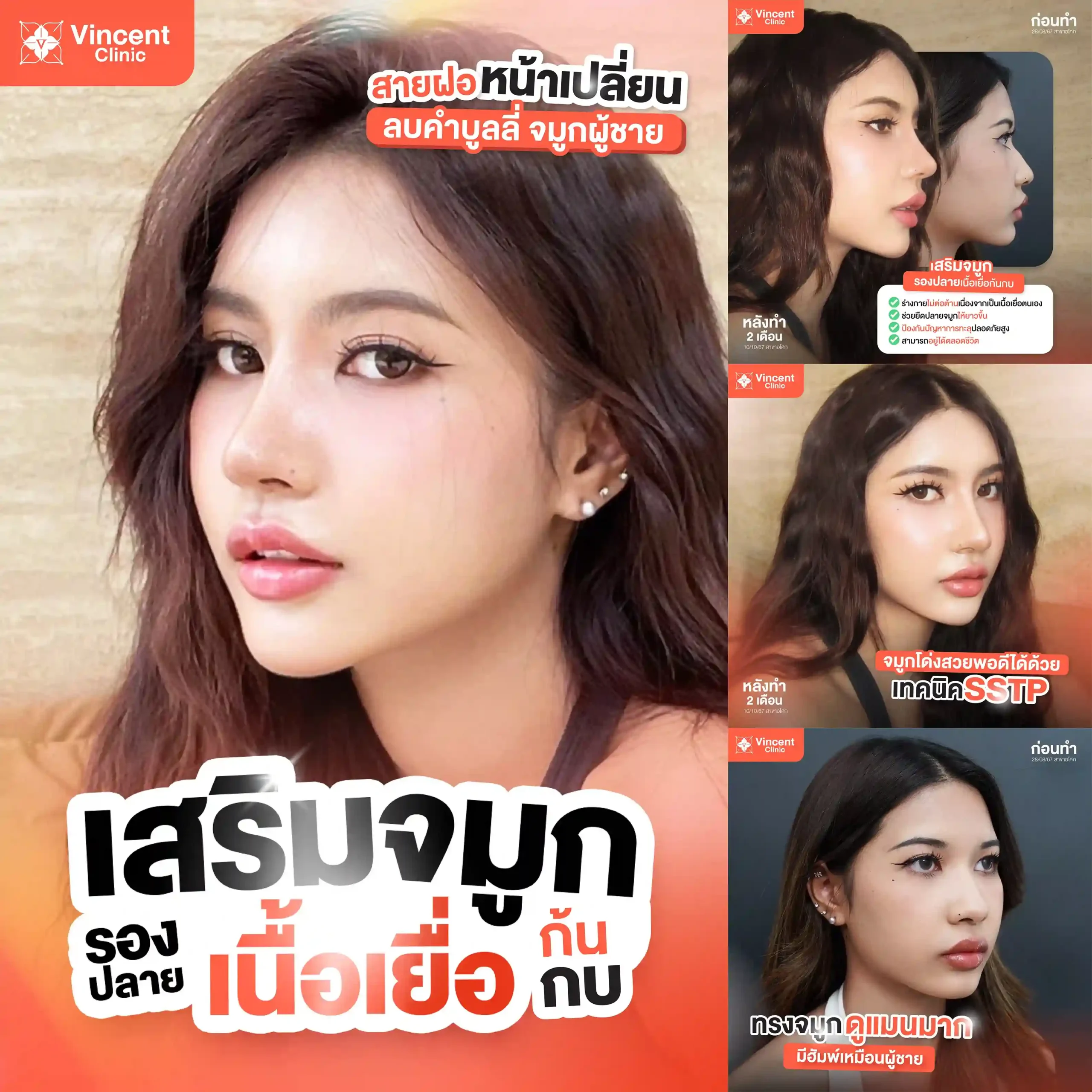 นอกเหนือจากผลลัพธ์ที่สวยงาม วินเซนต์คลินิกยังให้ความสำคัญสูงสุดใน เรื่องของความปลอดภัย โดยทุกเคสจะได้รับการดูแลภายใต้มาตรฐานสถานพยาบาลที่สะอาดและทันสมัย เครื่องมือทุกชิ้นผ่านการฆ่าเชื้อตามมาตรฐานสากล AACI พร้อมการคัดสรรวัสดุซิลิโคนและเทคนิคการเสริมที่เหมาะสมกับโครงสร้างจมูกของแต่ละบุคคลเพื่อป้องกันปัญหาในระยะยาว เช่น การทะลุหรือเอียง ท่านจึงมั่นใจได้ว่าการเสริมจมูกที่นี่ไม่เพียงแต่จะได้ทรงที่สวยสับตามสไตล์สายฝอ แต่ยังมาพร้อมความปลอดภัยและการดูแลอย่างใกล้ชิดจากทีมแพทย์ในทุกขั้นตอน